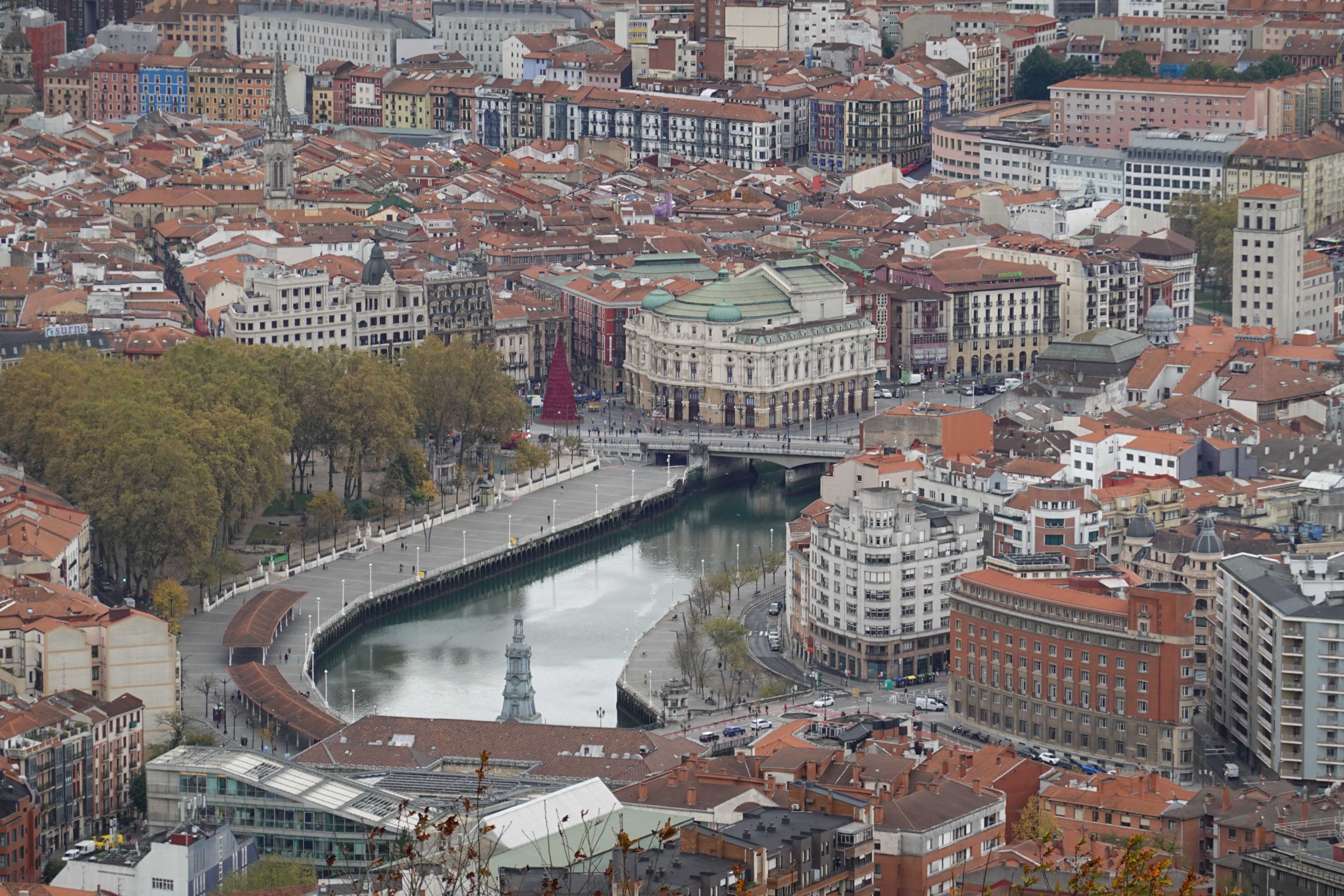 Bilbao is situated in a river valley surrounded by hills. An unnaturally red Christmas tree stands out from the old town area.