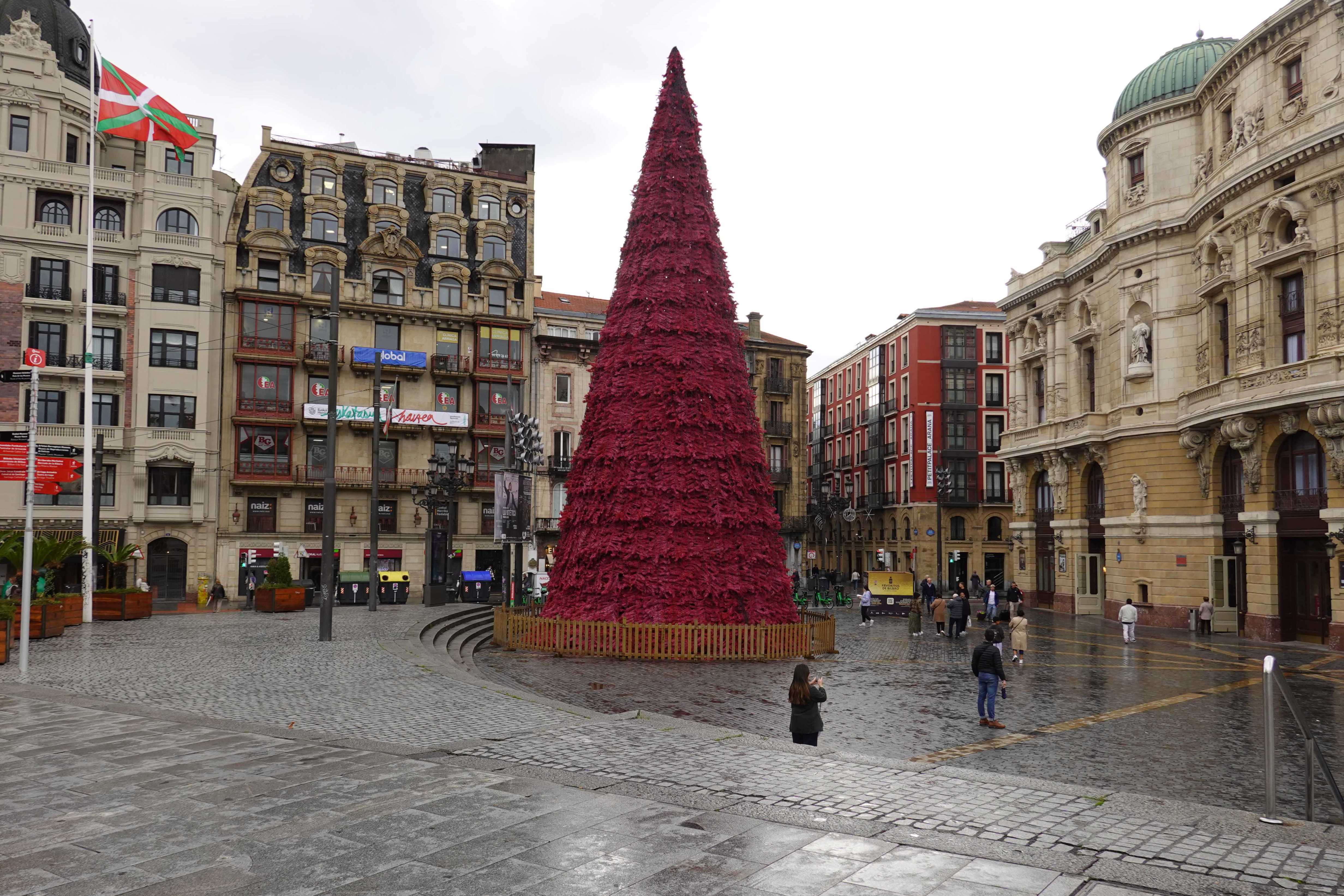 The Christmas tree is rather gloomy. Since it’s the start of November, maybe it’s just been erected and not decorated yet. The beautiful Basque flag on the left looks more Christmassy. What day is it anyway?