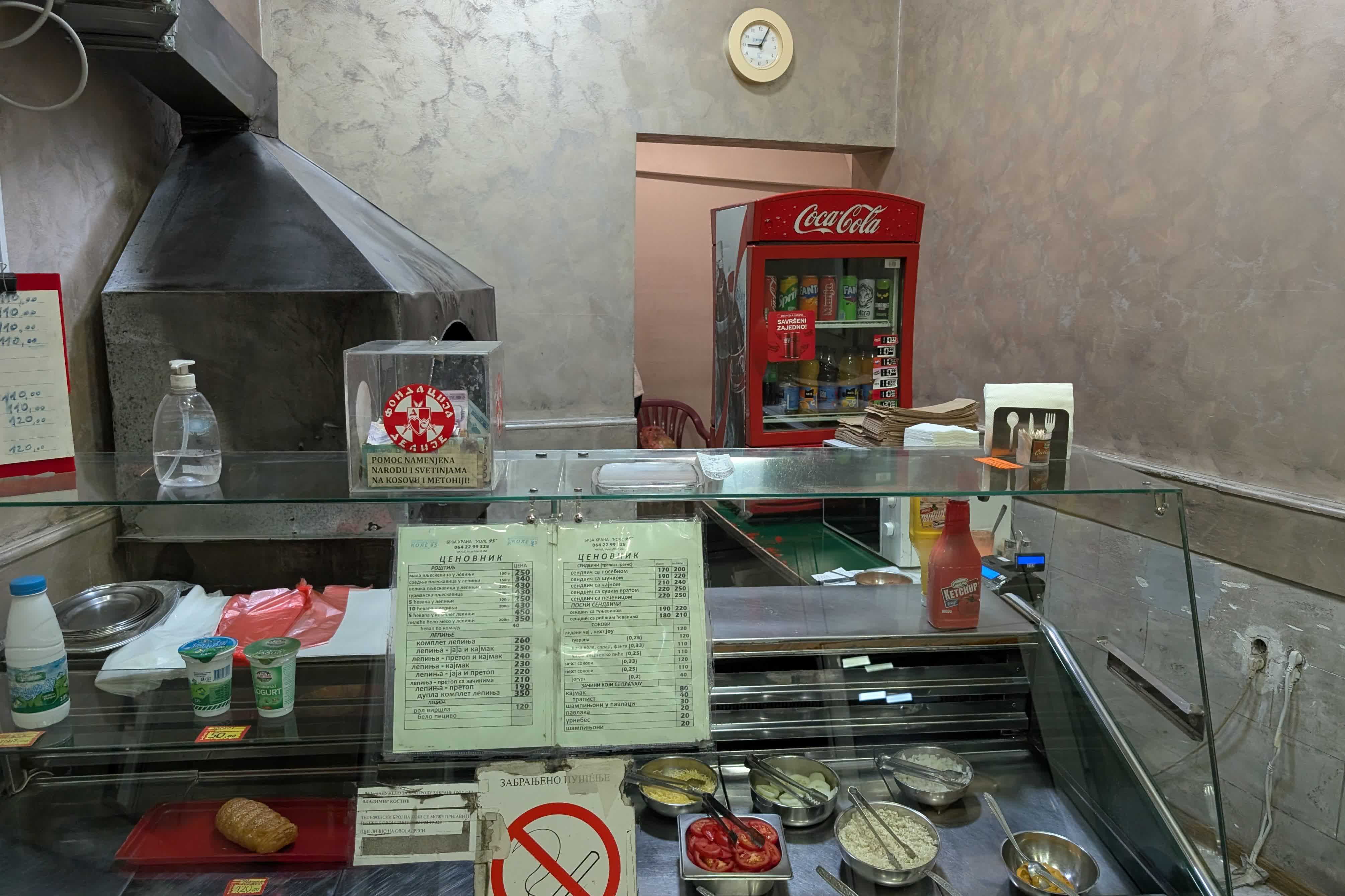 Such as a typical local pljeskavica place. Notice the donation box for “the people and the holy sites in Kosovo and Metohija”. The place has a vibe like it should be visited after midnight, preferably drunk.