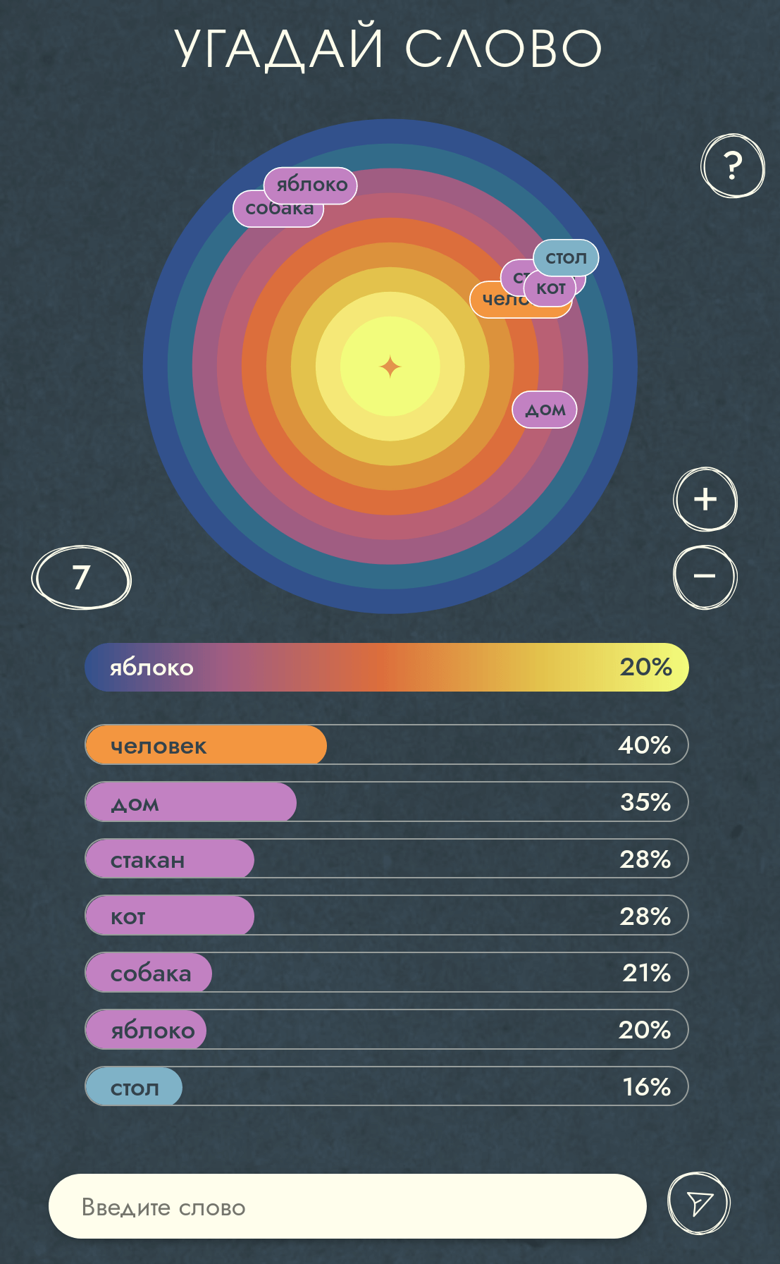 - Guess Word (React, TypeScript, d3.js): Russian word-guessing game, 50k+ total players, 2023